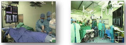 图注:在一站式杂交手术室内同期进行造影侧枝封堵(左)及外科手术(右)