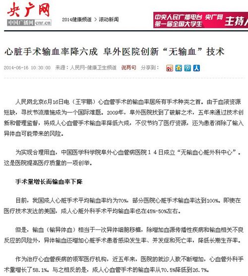 中国广播网:心脏手术输血率降六成 阜外医院创新“无输血”技术