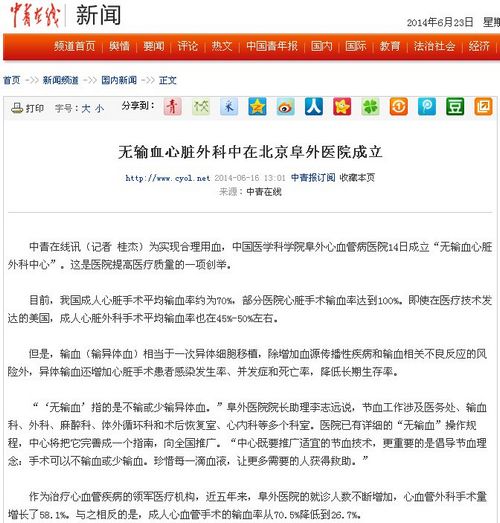中国青年报:无输血心脏外科中在北京阜外医院成立