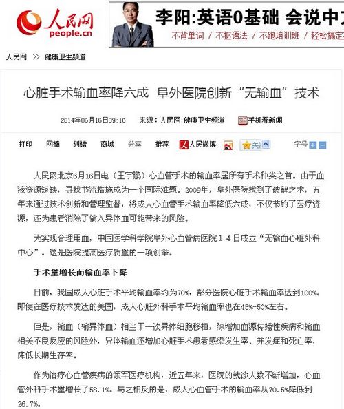人民网:心脏手术输血率降六成 阜外医院创新“无输血”技术