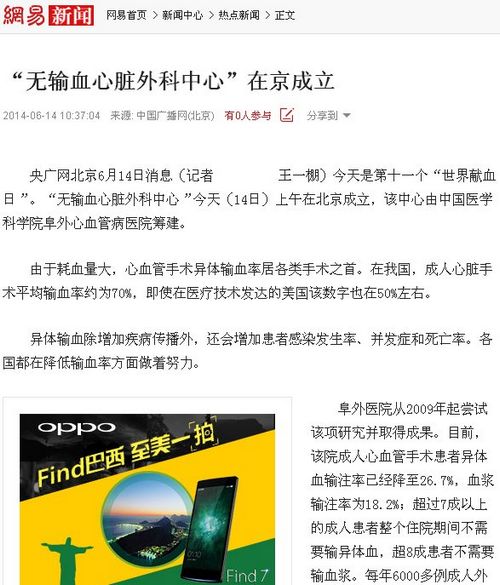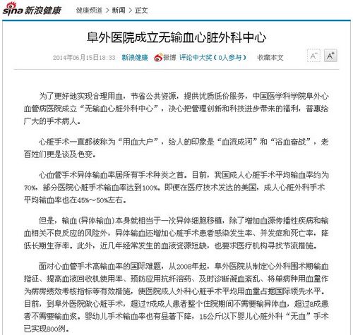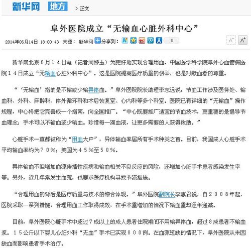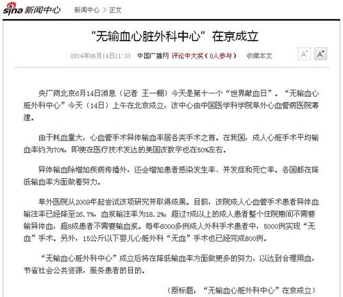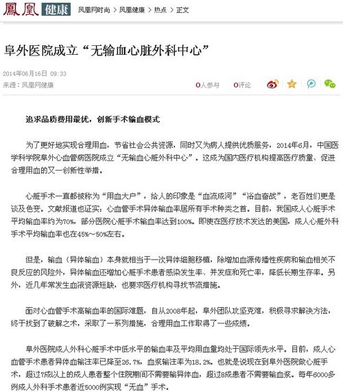 凤凰网:阜外医院成立“无输血心脏外科中心”