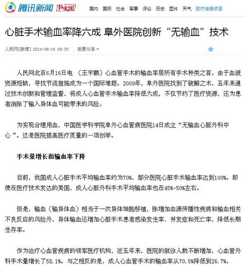 腾讯网:心脏手术输血率降六成 阜外医院创新“无输血”技术