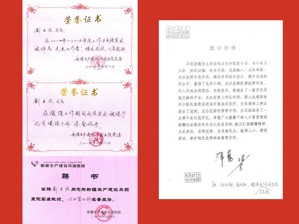 2015年9月,刘亚欣同志圆满完成援疆任务返院。基于刘亚欣兢兢业业、坚持以病人为中心的工作态度,得到兵团领导和医护人员的高度认可,被新疆生产建设兵团医院聘为心血管内科名誉主任,被授予“优秀援疆干部”和“先进工作者”荣誉称号。