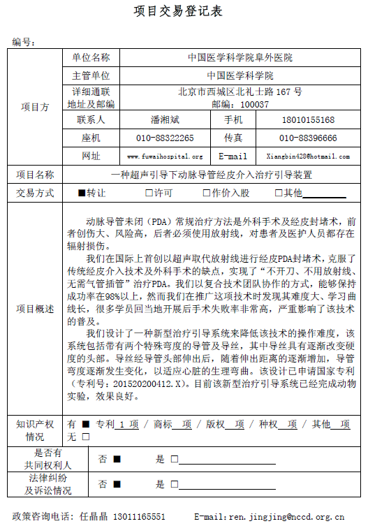 为贯彻《中共中央关于全面深化改革若干重大问题的决定》,大力实施创新驱动发展战略,中国医学科学院阜外医院为充分调动医院科技人员创新创业积极性,促进科技成果转化,现将我院拟转化科技成果信息“一种超声引导下动脉导管经皮介入治疗引导装置”公告7个工作日。意向受让申请书递交截止日期为2018年11月28日17:00整。意向受让方应当在公告期限内,向中国医学科学院阜外医院提出受让申请,并递交《意向受让申请书》(见附件)及相关材料,确认已知晓公告信息载明的所有内容,并承诺遵守相关国家法律法规。
