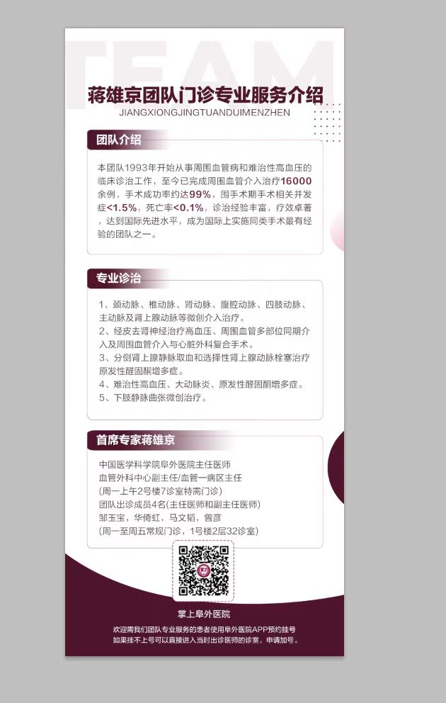 专长:1.颈动脉、椎动脉、肾动脉、腹腔动脉、四肢动脉、主动脉及肾上腺动脉等微创介入治疗 2.经皮去肾神经治疗高血压、周围血管多部位同期介入及周围血管介入与心脏外科复合手术 3.分侧肾上腺静脉取血和选择性肾上腺动脉栓塞治疗原发性醛固酮增多症 4.难治性高血压、大动脉炎、原发性醛固酮增多症 5.下肢静脉曲张