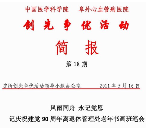 2011年7月1日是伟大的中国共产党成立90周年的日子,阜外心血管病医院离退休管理处老年书法绘画班的同志们于2011年5月3日举行了庆祝建党90周年笔会。