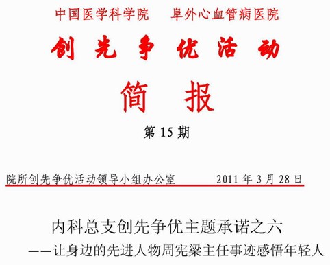 2011年3月23日,内科总支六支部践行创先争优主题承诺活动之六--,邀请了我院首都十大健康卫士、白求恩奖章获得者、门诊部主任周宪梁教授给年轻的党员和护士作了一个先进事迹报告会。