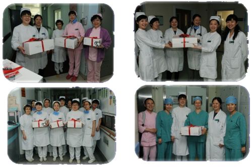 在工会和护理部的组织下,5月10日一大早,李惠君党委书记、李庆印院长助理,以及工会高虹副主席、工会曲家珍副主席、内科总支柳志红书记分别向全院各科室护士送去了悉心定制的蛋糕并带去了真挚的慰问。护士们非常感动,她们在迎来自己节日的同时,深深感谢院领导的关怀和祝福,备受鼓舞。
