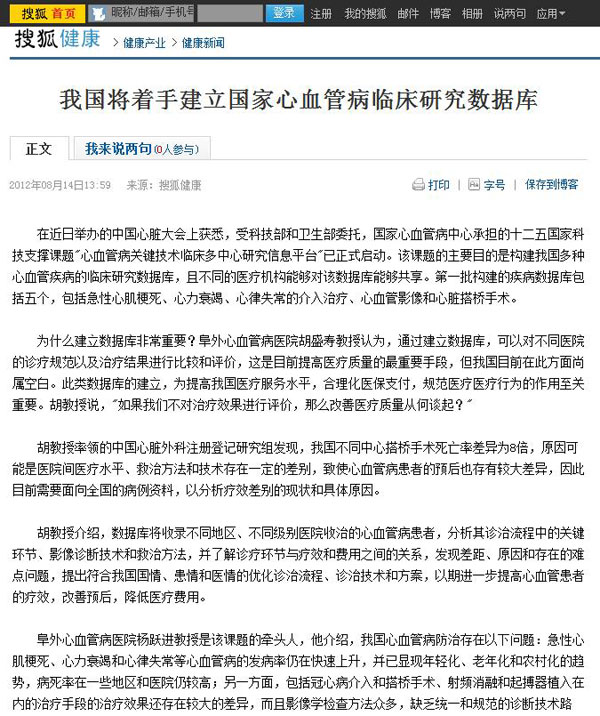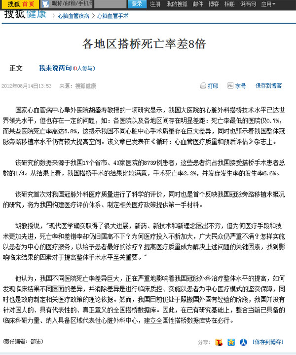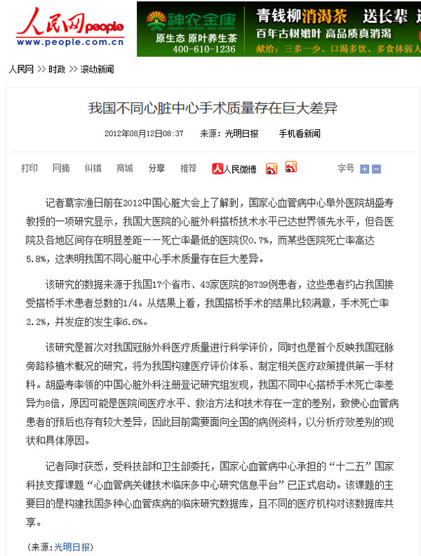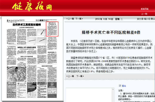 中国网:我国不同医院冠状动脉搭桥手术死亡率相差8倍