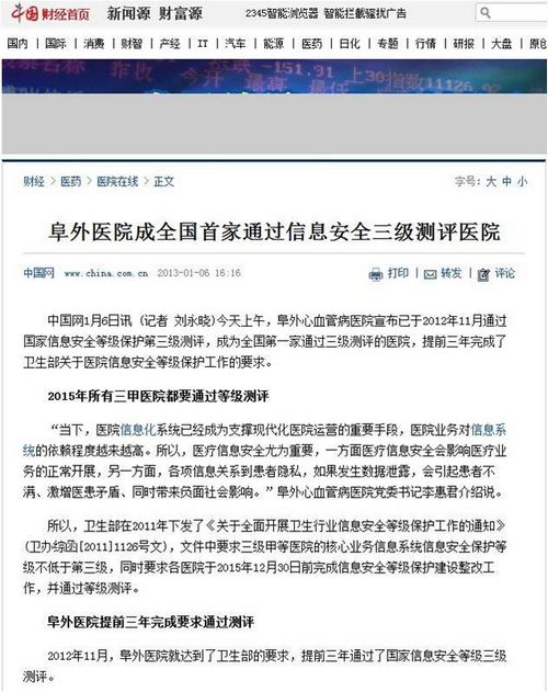 2012年11月,阜外医院就达到了卫生部的要求,提前三年通过了国家信息安全等级三级测评。
