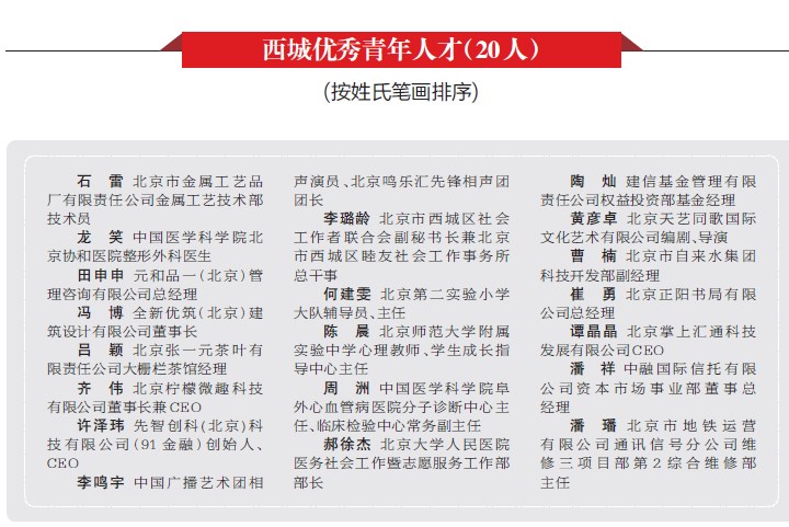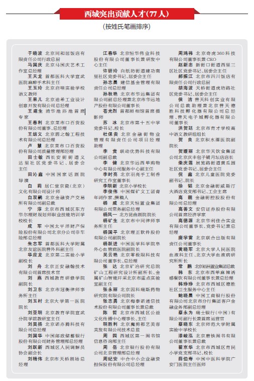 北京市西城区为实现紧紧围绕创建“人才生态区”的战略目标,在西城区推出的第二届“百名英才”评选活动,一百名优秀人才分别来自辖区内的各个领域。他们都在各自领域作出重要贡献,在本专业领域内取得重要成果,为服务区域科学发展发挥了重要作用,充分展示出西城英才自强不息、勇于开拓、奉献社会的优秀品格、突出业绩和时代风采!