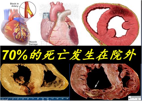 图2为大家展示的是不同的冠状动脉堵塞之后,导致的心肌梗死。那么可能有人要问为什么有的病人发生心梗后立刻死亡了,有的就没有死亡呢?这个与很多因素有关系,最重要的因素是患者本身的发病部位。讲到心肌梗死我们更要注意的是70%病人的死亡是发生在院外,可见心肌梗死的预防与自救是十分重要的。