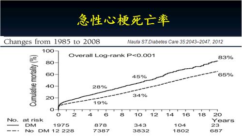 图3展示的是对心肌梗死的病人随访二十年的结果。我们看到随访二十年的时候,如果患者有糖尿病,就容易发生心肌梗死合并糖尿病,此时患者的死亡率为83%;如果没有糖尿病患者的死亡率为65%。如果我们再观察一下近年五年心肌梗死的死亡率,如果有糖尿病,心肌梗死五年的死亡率是28%,没有糖尿病患者的死亡率是19%。这张图就是告诉我们,心肌梗死死亡率是很高的,再一次说明心肌梗死的预防与自救是十分重要的。