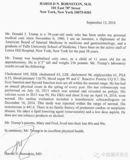 近期,美国共和党籍总统提名人特朗普在参加DR.OZ节目录制中公开了一份他的私人医生撰写的一份有关他的健康状况的报告,报告称,根据体检结果,“特朗普身体状况很好”。