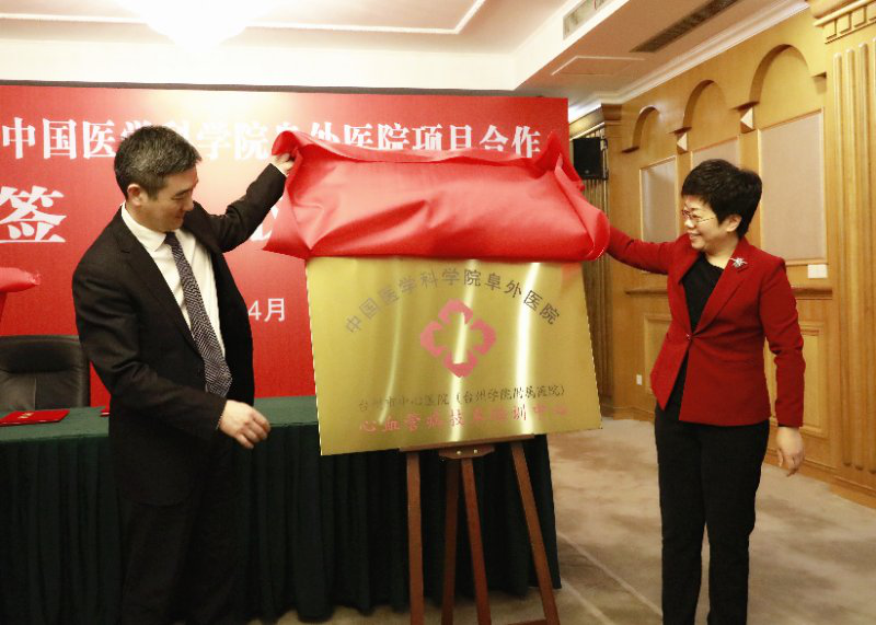 2019-4-14 国家心血管中心副主任、中国医学科学院阜外医院副院长郑哲与台州市市委书记陈奕君共同为中国医学科学院阜外医院台州恩泽医疗中心(集团)心血管病技术培训中心和中国医学科学院阜外医院台州市中心医院(台州学院附属医院)心血管病技术培训中心揭牌