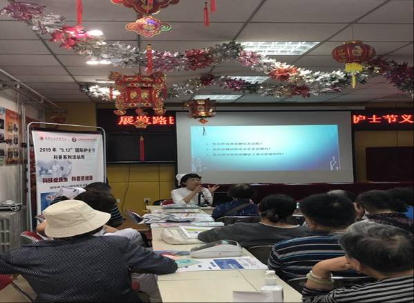 王宣护士长为社区居民进行了《血糖仪,您会正确使用吗?》的讲座,在场听众积极发问,护士长进行了耐心细致的解答和专业的技术指导,纠正了糖尿病患者对于血糖仪多年的使用误区。