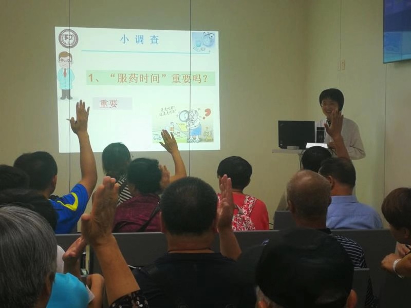 杜淑娴药师从影响服药时间的因素、药物体内过程、药物吸收的部位、药物的类型等方面深入浅出地为在座同种们进行了专业的科普宣讲。尽管午间休息时间很短,宣讲现场座无虚席,大家对科普内容兴致浓厚、主动举手回答杜药师提出的各个问题,现场气氛活跃,充分体现了宣讲内容的重要性和实用性,切实做到了解答老百姓心中的疑惑。