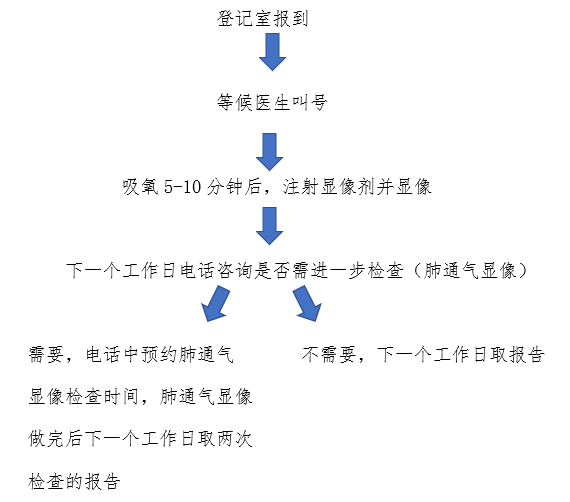 2.肺灌注/通气显像相结合可提高肺栓塞的诊断准确性,因此肺灌注显像检查后第二个工作日上午10:00后(节假日除外)先打电话(010-88322724)询问,看是否需要加做肺通气显像,并预约检查时间。