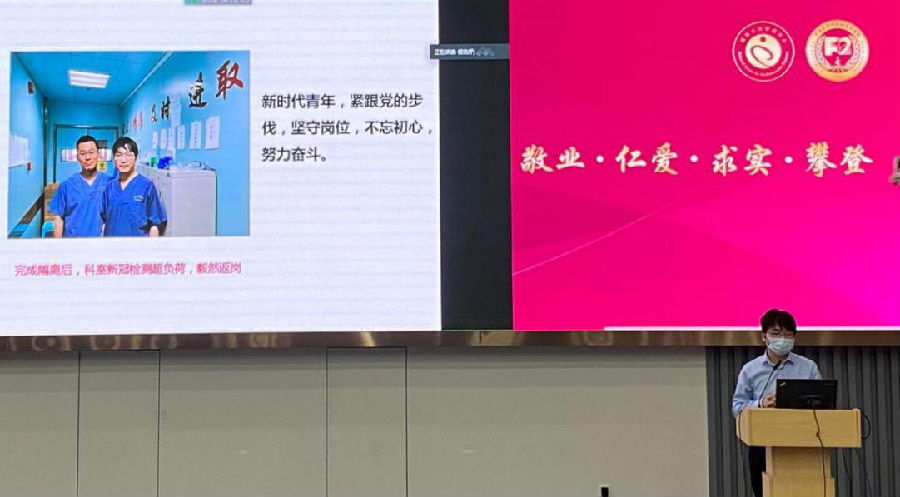 随后,医科院援鄂抗疫医疗检测队队员、实验诊断中心的陈前龙与大家讲述了自己的抗疫经历。作为医疗监测队首批派往武汉一线的“先遣队员”,陈前龙与战友们3天完成了实验室的搭建、工作流程的梳理、物资器材的配备,经过51天的日夜奋战,完成了武汉东西湖方舱医院2200余名患者的核酸检测,实现了出征时许下的“零感染、凯旋归”的承诺。同时,他分享了作为一名普通群众在援鄂期间与党员同志们一起奋战的所见所闻,以及在党员同志和党组织感召下,在战“疫”一线主动递交向党组织入党申请书的心路历程。他表示,能成为一名光荣的共产党员,是一份沉甸甸的责任,也希望在未来工作和生活中,把这份责任转换为赓续前进的不竭动力,为党的事业贡献青春力量!