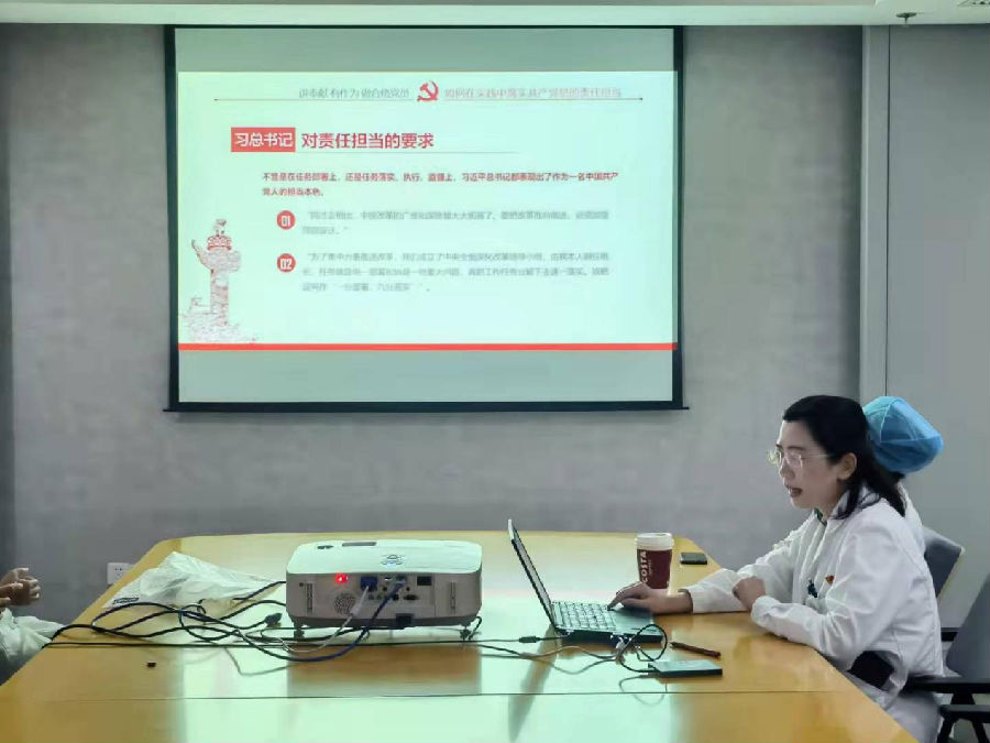 主题党日活动中,樊晓寒书记首先向大家汇报了以“讲奉献 有作为 做合格共产党员”为主题的党课,党课中强调“奉献责任担当是共产党员的基本素质,全面从严治党新常态下为何强调责任担当,如何在实践中落实共产党员的责任担当”三个方面。党课要求全体党员:不忘初心,牢记使命。初心就是知难而进,迎难而上的英雄气概;是为人民服务,为患者造福,数十年如一日的坚守;是对党忠诚,心系患者,无私奉献的优秀品质。作为一名医务工作者,我们必须成为这样的人,风雨同舟,团结奋进,无私奉献,无怨无悔。