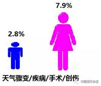 另外,女士在天气和环境骤变时,以及在疾病、手术、创伤比男士耐受力差一些,有7.9%的女士发病,而男士仅占2.8%。这也可能是女士发病的年龄比男士较大有一定关系。